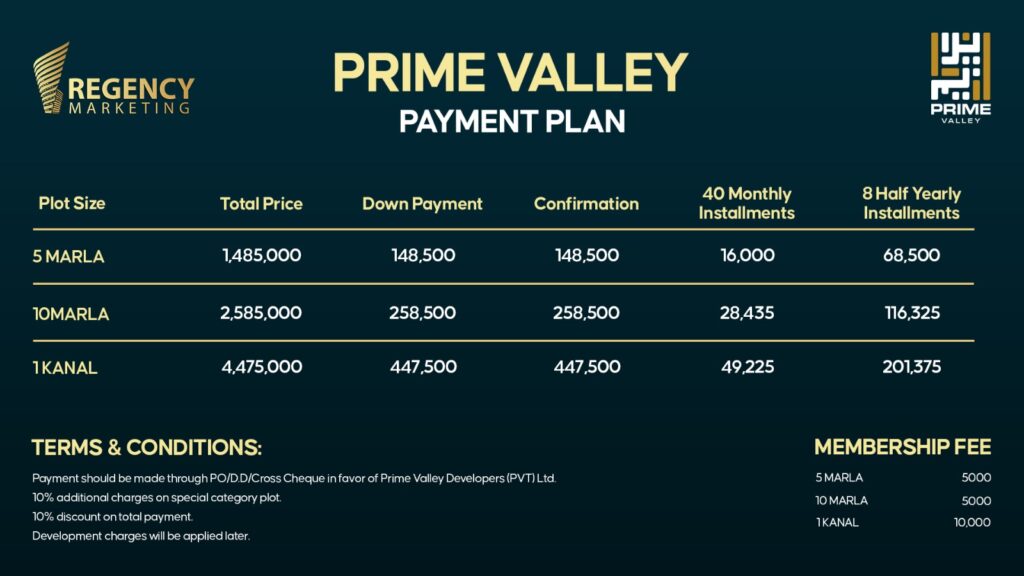 Among your options to invest in 05 Marla, 10 Marla and 01 Kanal, your plot will be named after you and booked for you at 15% payment of the whole amount. Which means the down payment is at 10%, and confirmation is only 5%. These are the prelaunch rates that are to be revised as soon as the society is launched. With 5 Marla, starting at only 12,000 PKR monthly installment, there couldn’t be a more convenient option of investment for you out there. Prime Valley Installment and Payment plan is one of its kind, with high convenience for all. Completing the payment in 35 monthly installments, or 10 quarterly installments, the property will be all yours!